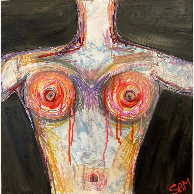by watching a series in which women go mega far with cosmetic injections etc. And they were so dissatisfied with their bodies, this came to me to paint completely from my head, my emotion was frustration.